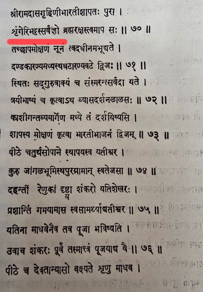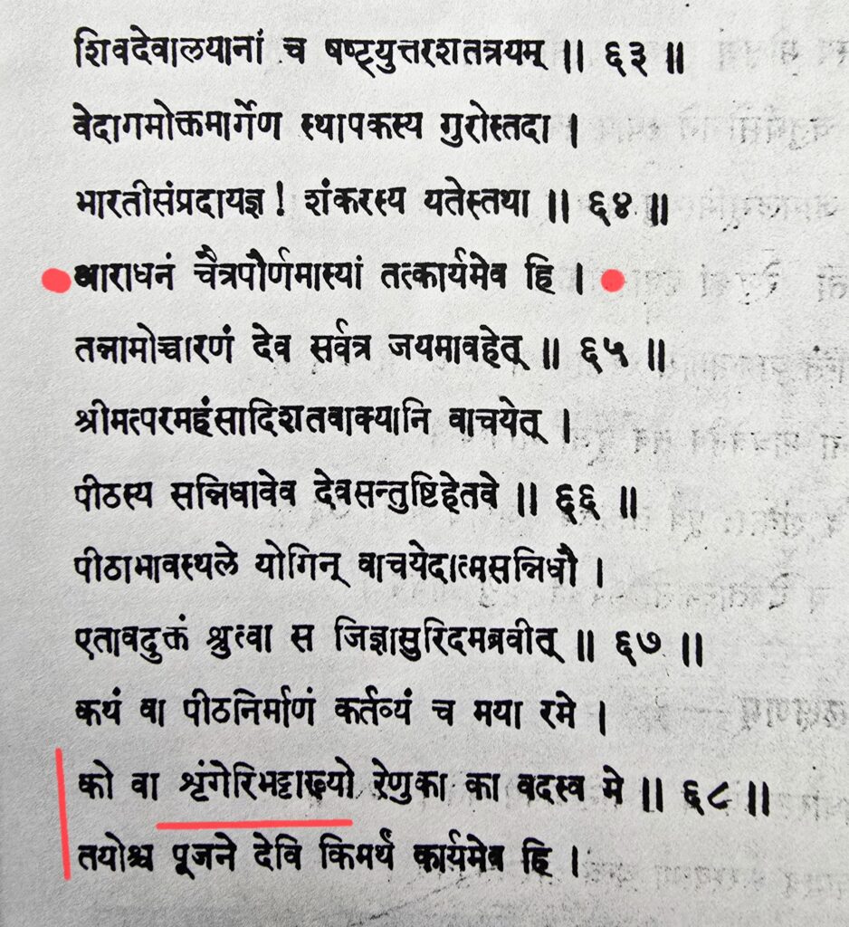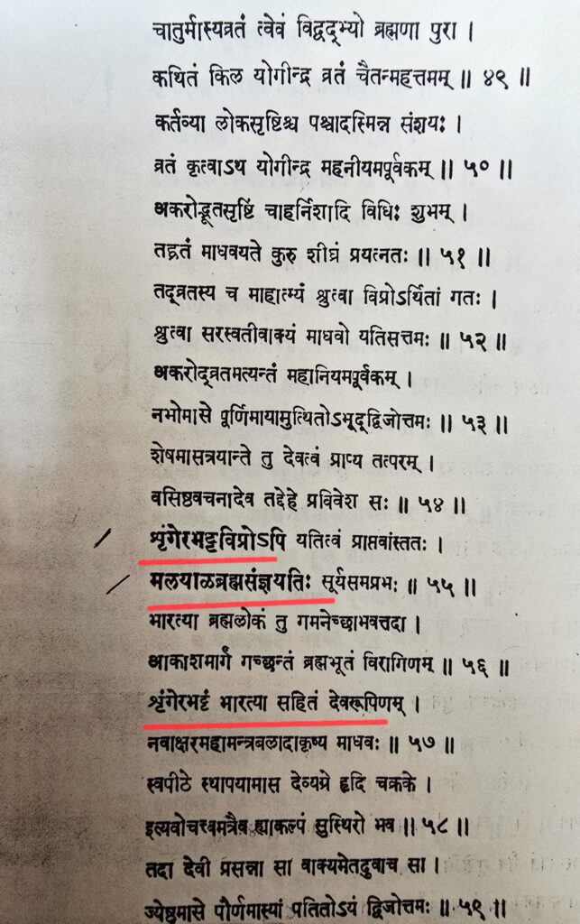 Even though it is said, the names Sringa-pura, Sringa-giri or Sringeri arose from their connection with Sage Rishyasringa, the literary and historical evidence, as well as the religious practices in the Mathas of Sri Vidyaranya Swami’s lineage, suggest otherwise.Not all the Mathas under this lineage have any hermitage of Rishyasringa in their vicinity, but all of them have shrines or worship places specially dedicated to Sringin- Malayala Brahman.Hence, it is most probable that all these places identified with the suffix “Sringeri” were originally named after Sringin, the Malayala Brahmana, who assisted and was initiated by Sri Vidyaranya Swami.Over time, through linguistic change and popular belief, the name might have become connected with Rishyasringa, whose ashrama, as pointed out in the Srimad Valmiki Ramayana and the Mahabharata, is situated in Anga Desa, the region of modern Assam or its borders.Images: from Chapters 32 and 33 of the Renuka Tantra