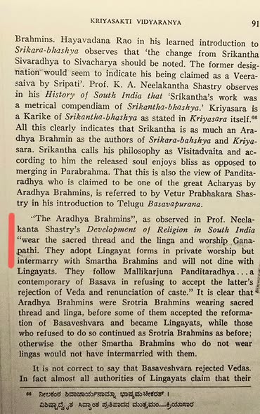 Prof.K.A.Neelakanta Sastri says, the Aradhyas of northern circar, Cuddapah, Kurnool and Mysore wear the sacred thread and the linga and worship Ganapati.